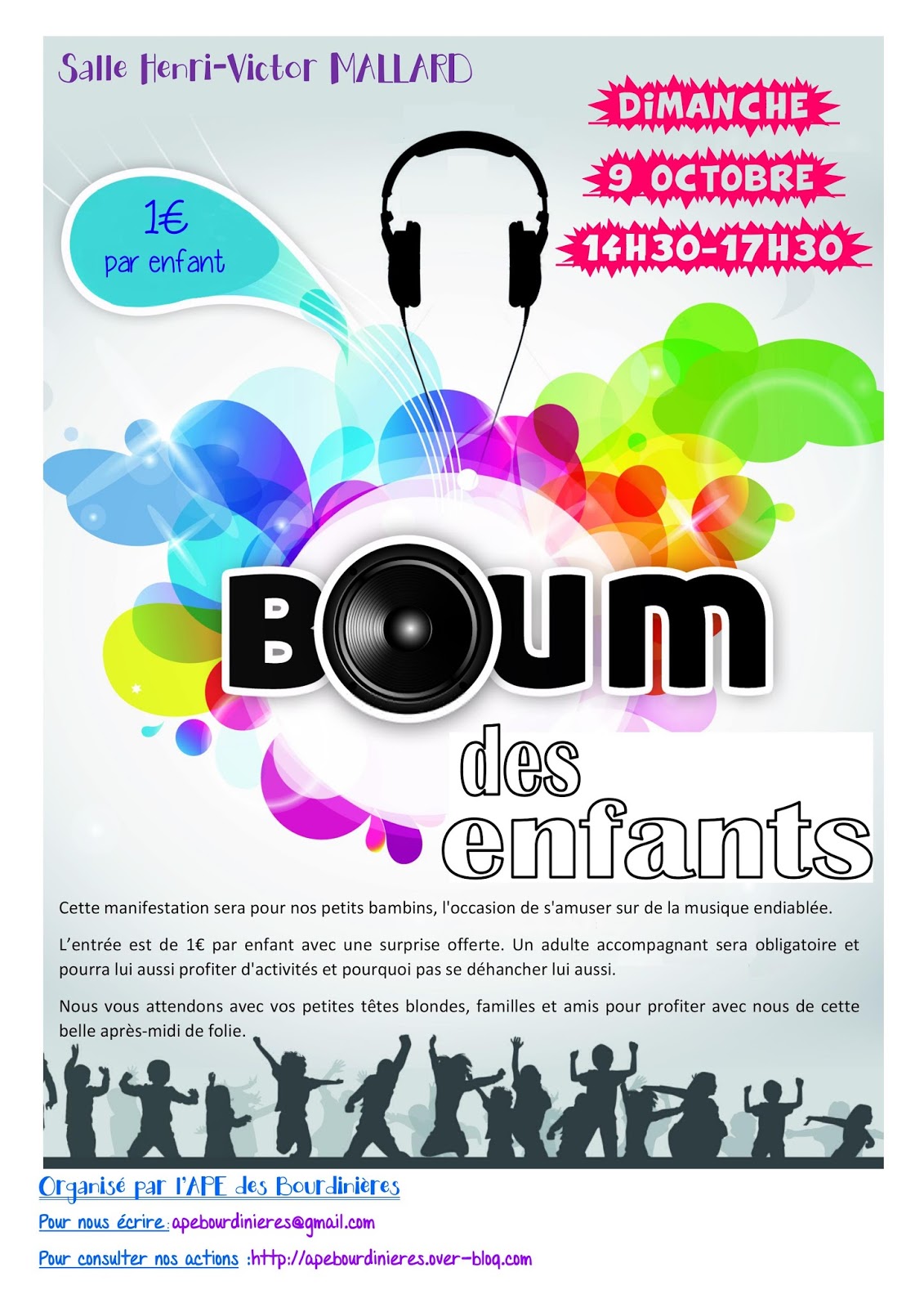 Boum des enfants 2016 3 octobre 2016 Par APE Bourdinieres ancien blog Non Nous vous attendons dimanche pour la traditionnelle boum des enfants. Vous trouverez une piste de danse en feu, mais aussi un espace plus au calme pour les parents avec quelques jeux de société. Bar et vente de confiserie sur place. Navigation de l’article Article précédentPrécédente Assemblée GénéraleArticle suivantSuivante Fête de Noel